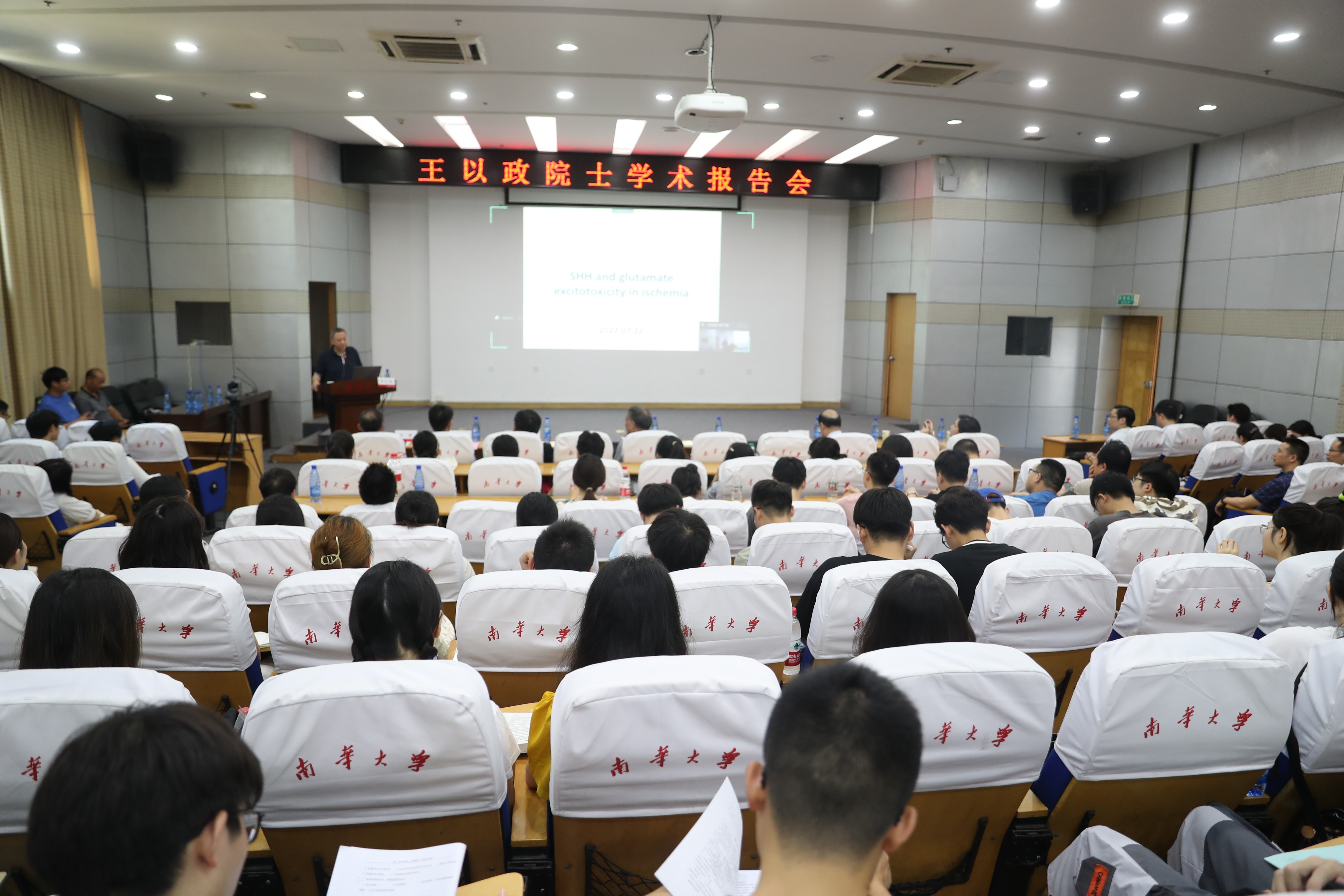 王以政院士向在场师生作“Sonic hedgehog and glutamate excitotoxicity in ischemia”主题报告,介绍了他主持的实验室近些年围绕脑神经元开展的主要科研工作及临床应用分析。报告后,他与现场师生进行了互动交流。