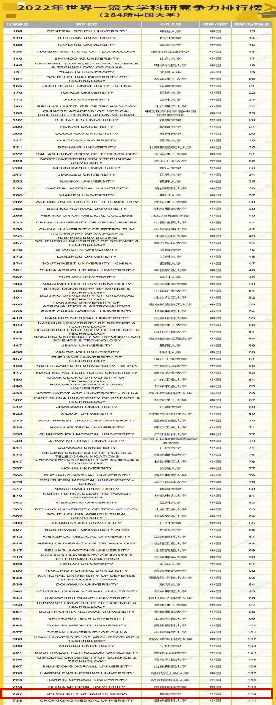 其中,清华大学(11名),北京大学(12名),浙江大学(20名),上海交通大学(36名),中国科学院大学(39名),复旦大学(64名),武汉大学(71名),华中科技大学(72名),中山大学(74名)和四川大学(97名)入围全球100强高校。