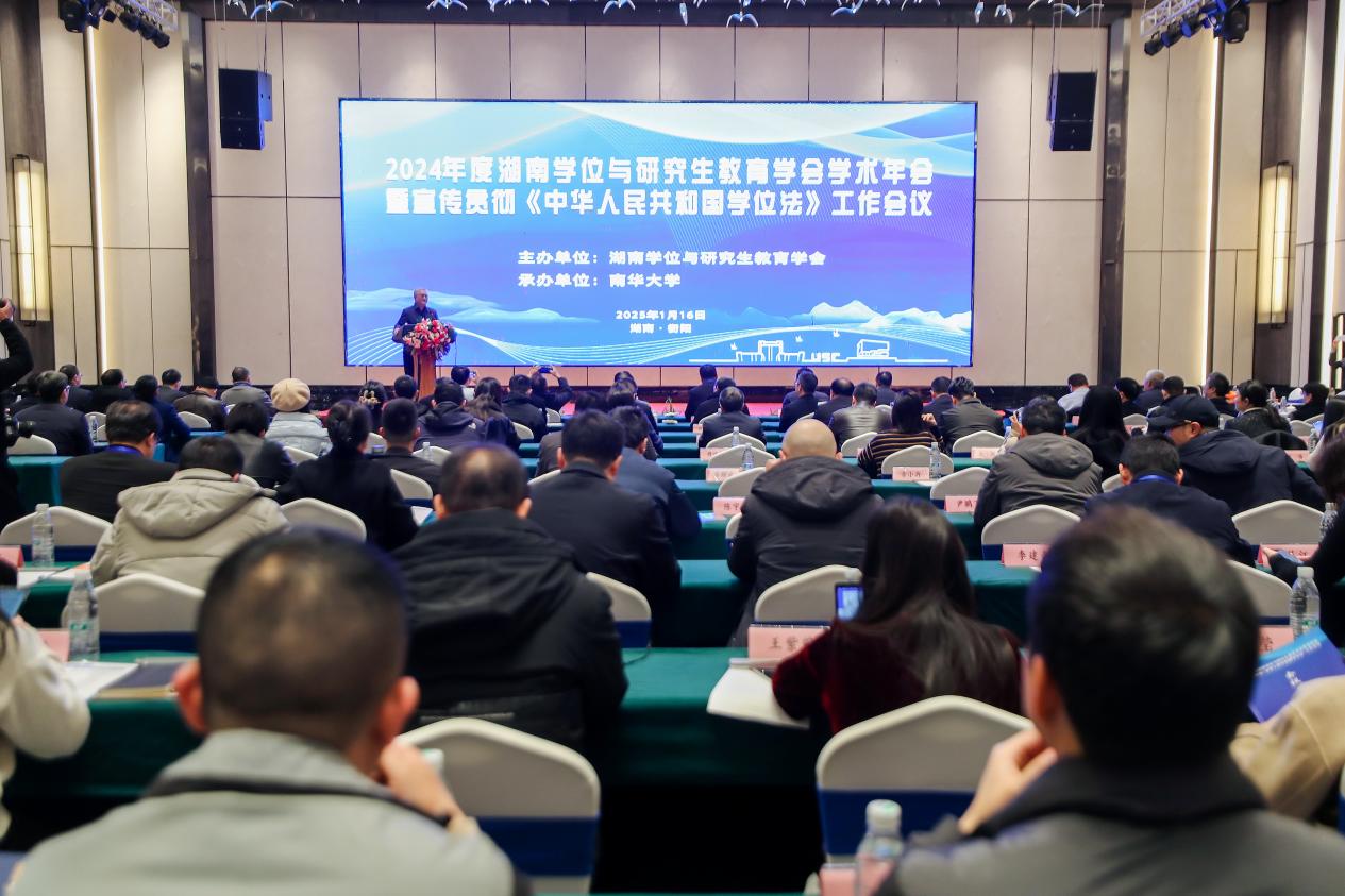 1月16日,由湖南学位与研究生教育学会主办、PA视讯平台承办的2024年度湖南学位与研究生教育学会学术年会暨宣传贯彻《中华人民共和国学位法》工作会议在衡阳召开。来自国防科技大学、中南大学、湖南大学等46家省内高校、科研院所的有关负责人、学位与研究生教育管理人员及教师代表150余人共聚一堂,深入学习贯彻党的二十大和二十届二中、三中全会精神,落实全国教育大会部署,交流学位与研究生教育管理工作经验,推动《中华人民共和国学位法》落地。PA视讯平台党委书记高山出席开幕式并致辞。省教育厅学位管理与研究生教育处处长颜胜利主持开幕式。