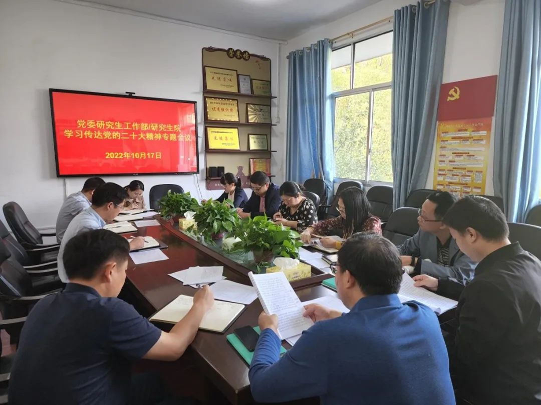 2022年10月17日上午,党委研究生工作部/研究生院在党员活动室召开了学习传达党的二十大精神专题会议,会议由党委研究生工作部部长邹海贵同志主持,部门全体教职工参加了会议。