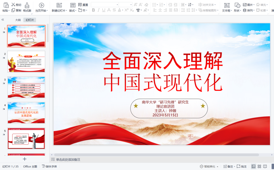 宣讲团成员刘惠美同学从“认识中国式现代化的发展逻辑、深入理解中国式现代化、把握中国式现代化的前进方向、激扬青春梦,奋进新征程”四个方面阐述中国式现代化的核心要义。在药学院的认真组织和学院全体研究生的积极参与下,本次宣讲活动取得圆满成功。同学们纷纷表示,奋斗永远是青春最亮丽的底色。新时代,中国青年要肯奋斗,不躺平。南华学子要用青春的能动力和创造力激荡起民族复兴的澎湃春潮,用青春的智慧和汗水打拼出一个更加美好的中国!