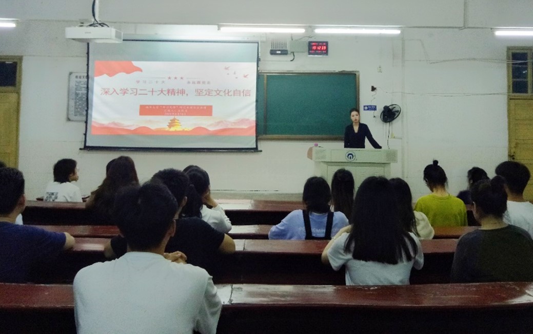 宣讲团成员李露同学走进护理学院宣讲党的二十大精神,她以“深入学习二十大精神,坚定文化自信”为题,给在场同学讲述了党的二十大重要内容、文化建设内容以及为何和如何传承和大力弘扬中华优秀传统文化。她指出,“文运同国运相牵,文脉同国脉相连”,我们要以时代精神赓续优秀传统,更好构筑中国精神、中国价值、中国力量,让中华文明同各国人民创造的多彩文明一道,为人类提供正确精神指引。此次宣讲活动不仅增强了护理学院学子对习近平新时代中国特色社会主义思想的理解把握,将“中国式现代化”融会贯通其间,激发了同学们立大志、明大德、肯吃苦、敢担当的信心和决心。