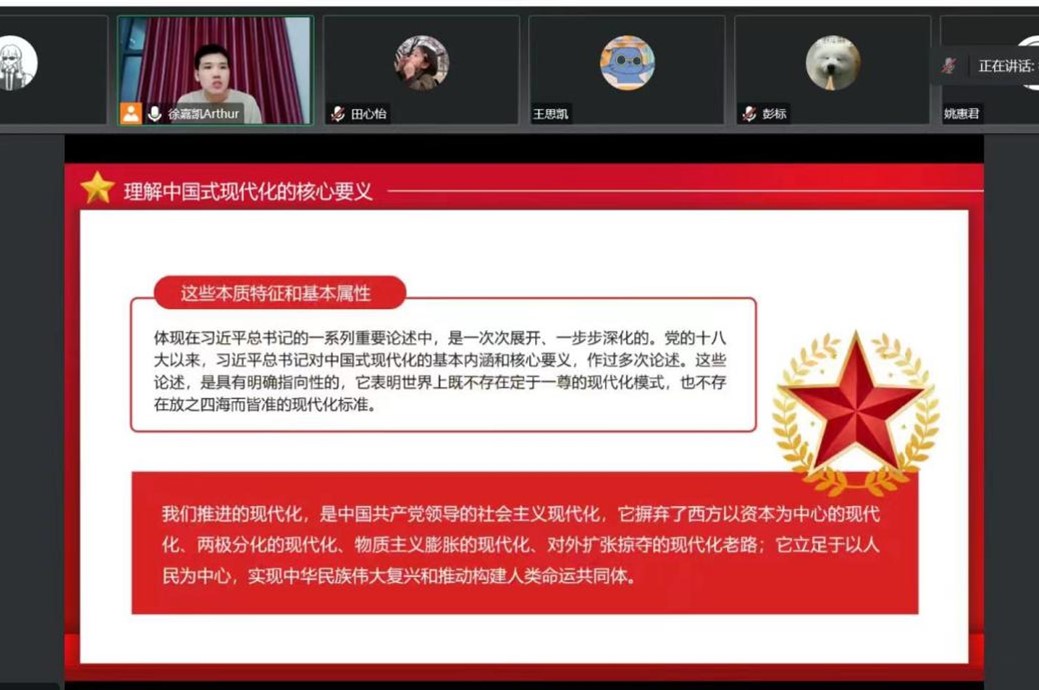 宣讲团成员苏亚栋同学面向PA视讯平台附属第一临床学院全体研究生进行线上宣讲活动,主题为全面深入理解中国式现代化。苏亚栋同学指出,中国式现代化是中国共产党领导的社会主义现代化,是与中华民族伟大复兴紧紧连在一起的。中国式现代化既有各国现代化的共同特征,更有基于国情的中国特色。他呼吁新时代的青年用科学理论武装自己,坚定对马克思主义的信仰、对中国特色社会主义的信念,坚定道路自信、理论自信、制度自信、文化自信。用青春的能动力和创造力激荡起民族复兴澎湃春潮,用青春的智慧和汗水打拼出一个更加美好的中国。