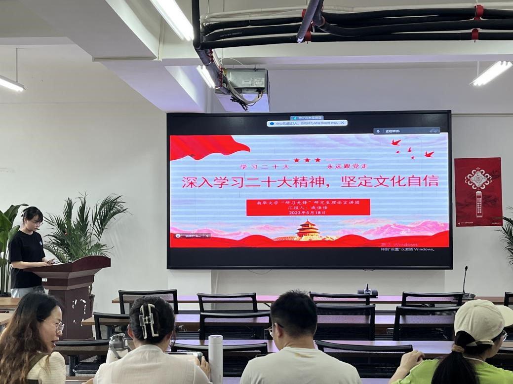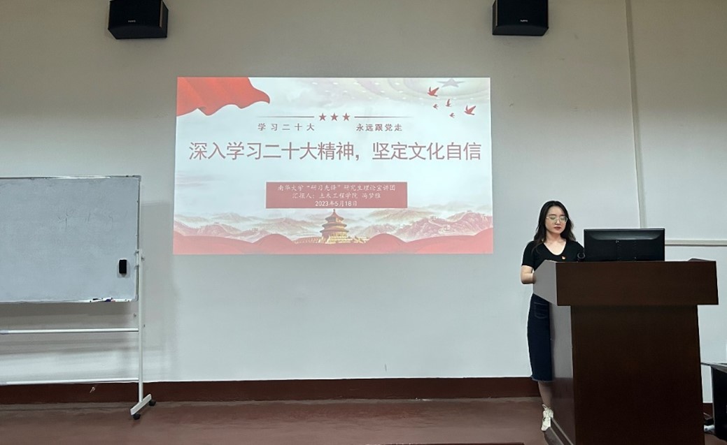 宣讲团成员李彦彦同学为化学化工学院全体研究生进行了理论宣讲活动。李彦彦同学以二十大精神慷慨激昂的进行引入,强调了全面推进文化建设的重要性。宣讲分为党的二十大的重要内容、党的二十大的文化建设内容、传承和大力弘扬中华优秀传统文化三个部分,提出“文运同国运相牵,文脉同国脉相连”,呼吁南华学子要以时代精神赓续优秀传统,更好构筑中国精神、中国价值、中国力量,让中华文明同各国人民创造的多彩文明一道,为人类提供正确精神指引。