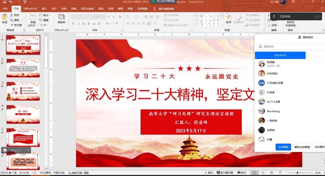 宣讲团成员段凌峰以线上会议的方式,为机械工程学院的同学们作了主题为“深入学习党的二十大精神,坚定文化自信”的理论宣讲。他带领机械工程学院的研究生们重点学习了党的二十大报告中关于文化自信的内容,着重强调了推进文化自信自强的重要意义,呼吁全体与会同学做文化自信的践行者,凝心聚力,铸就时代的新辉煌。