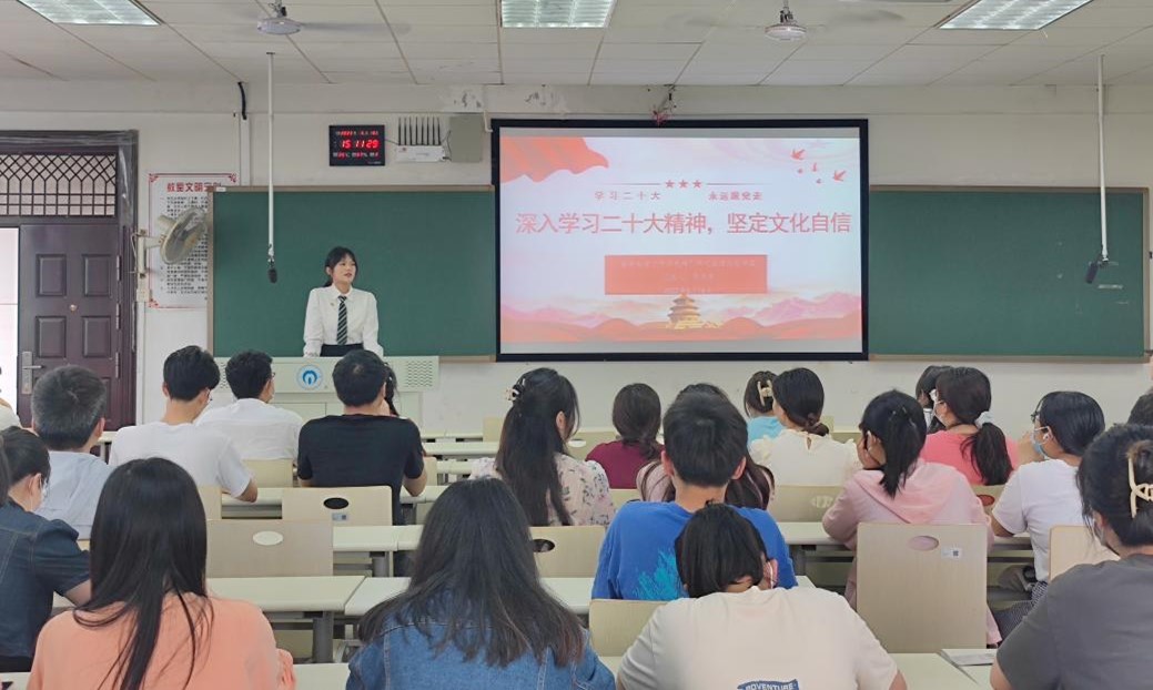 宣讲团成员蒋恬同学通过对二十大报告的主题和会议上提出的“三个务必”、“十年来的三件大事”、“六个必须坚持”等多方面进行梳理,呼吁同学们必须增强忧患意识并坚持底线思维,通过建设具有强大凝聚力和引领力的社会主义意识形态,广泛践行社会主义核心价值观,提高全社会文明程度,实现繁荣发展文化事业和文化产业、增强中华文明传播力影响力的目标。