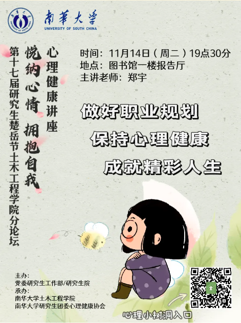 本次讲座以“悦纳心情,拥抱自我”为主题,在传递正能量的同时引导同学们充分认识自我、发挥自身的才能,做好一份可行性职业生涯规划。欢迎全体研究生参加~