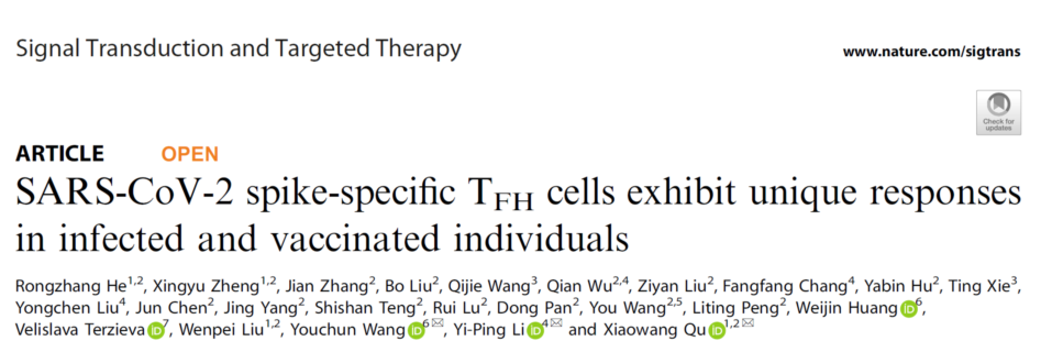 近日PA视讯平台基础医学院瞿小旺研究团队,中山大学中山医学院李义平与中国食品药品检定研究院王佑春的科研人员合作在国际权威学术期刊Signal Transduction and Targeted Therapy(IF=39.3)发表了最新的研究成果“SARS-CoV-2 spike-specific TFH cells exhibit unique responses in infected and vaccinated individuals”。该成果是瞿小旺团队继在Nature Microbiology和Cell后取得的又一重要进展。