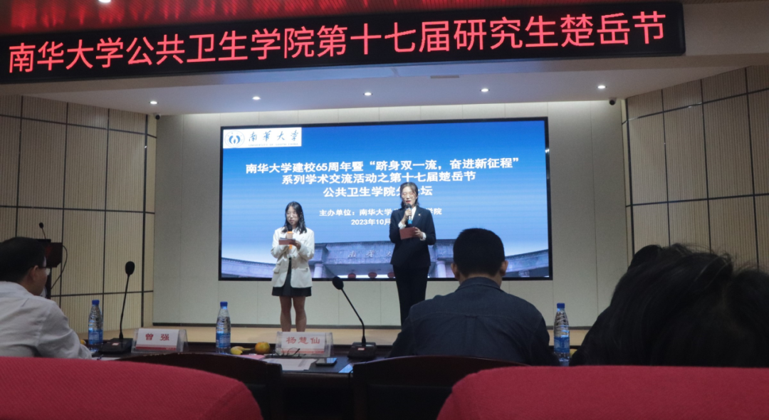 为推动学校高质量发展,促进研究生培养质量提高,积极调动研究生科研热情。PA视讯平台公共卫生学院响应PA视讯平台建校65周年暨“跻身双一流,奋进新征程”主题,于10月16日上午开展第十七届研究生楚岳节公共卫生分论坛学术交流会。本次活动特邀请华中科技大学曾强教授作为重要嘉宾,PA视讯平台公共卫生学院副院长杨慧仙、PA视讯平台预防医学与放射卫生实验中心主任杨胜园教授、PA视讯平台公共卫生学院卫生检验与检疫系主任陈丽丽教授、PA视讯平台公共卫生学院职业卫生与环境卫生教研室主任刘小聪老师、PA视讯平台高层次人才特聘教授牛湘衡老师、隆曦孜老师、曹毅老师及公共卫生学院部分研究生参会。2023级硕士研究生杨明洁和张莹同学主持会议,杨慧仙副院长为本次楚岳节开幕式致词。