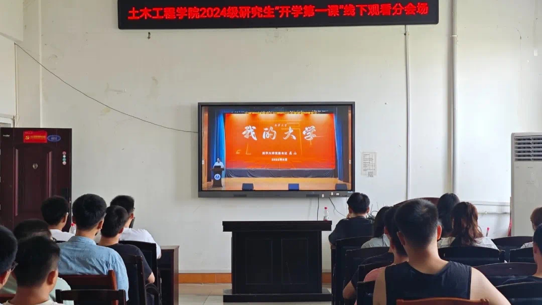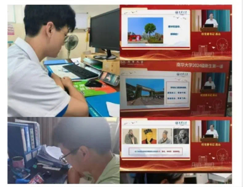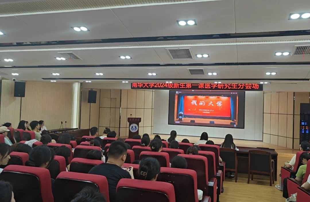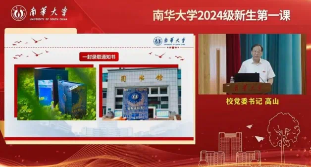 金秋雁城,硕果盈枝,立足南华,追梦未来。为做好新生入学教育,加强校园文化建设,统筹推进本硕博思政教育一体化,9月19日上午,校党委书记高山老师以“我的大学”为题面向2024级全体新生讲授新生第一课,本次授课采用线上线下结合的方式进行。高山老师勉励同学们涵养家国情怀,厚植理想信念;树立奋斗目标,不忘历史使命;学习南华精神,争做新时代追梦人。