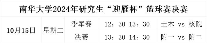 随着半决赛的圆满结束,“迎雁杯”篮球赛的决赛暨季军赛将于10月15日中午在南校体育馆举行。附一与附二两支球队将为了最终的冠军荣誉展开巅峰对决。两支队伍实力相当,风格各异,他们的对决无疑将吸引全校师生的目光,敬请期待!