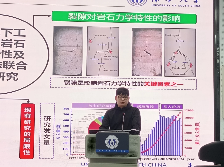 来自资源环境与安全工程学院矿业工程达奇,报告题目是《含平行裂隙岩石在联合动态静态加载下的能量耗散与损伤演化研究》,他的研究对于地质灾害预测和防治具有重要意义。