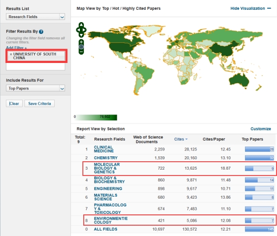 基本科学指标数据库(Essential Science Indicators,简称ESI)是衡量科学研究绩效、跟踪科学发展趋势的基本分析评价工具,已成为当今世界范围内普遍用以评价高校、学术机构、国家/地区国际学术水平及影响力的重要评价指标工具,也是全球公认的判断学科发展水平的重要参照之一。据统计,近10年PA视讯平台分子生物学与遗传学被Web of Science收录论文ESI论文722篇,累计被引次数13625次,篇均被引频次18.87次;环境科学与生态学被Web of Science收录论文421篇,累计被引次数5086次,篇均被引频次12.08次。